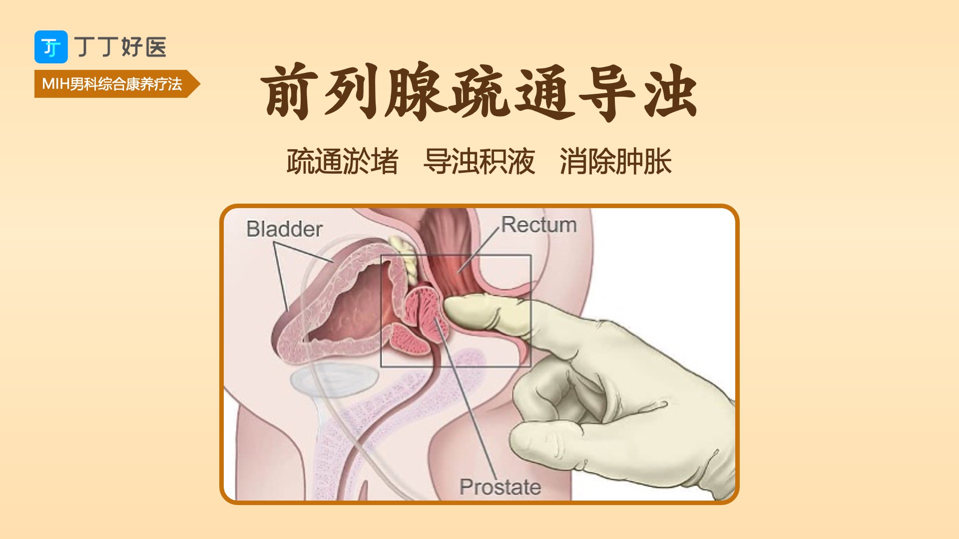 - 前列腺导浊,排空腺泡积液、缓解肿胀;